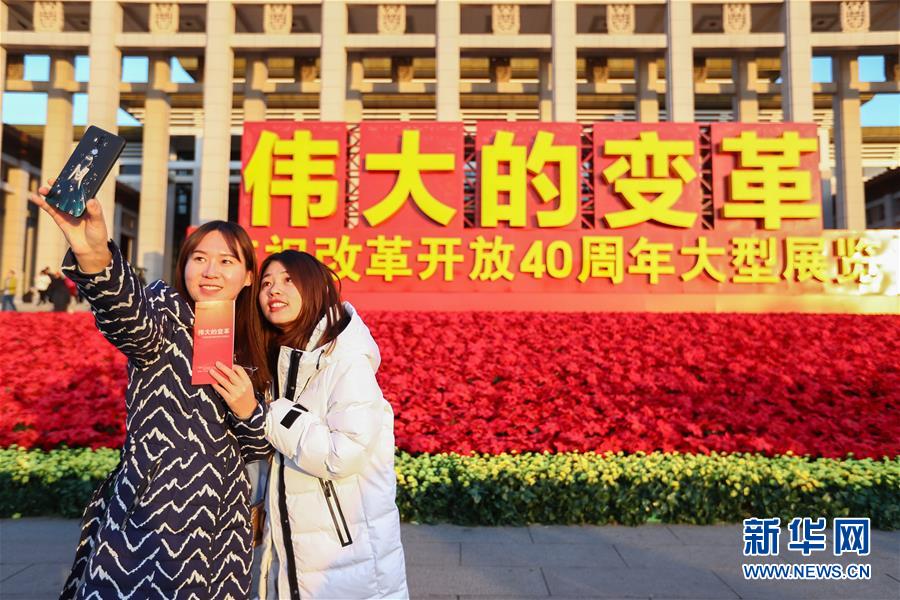 12月18日,參觀者在“偉大的變革——慶祝改革開放40周年大型展覽”外自拍留影。 截至當(dāng)日,在中國國家博物館舉行的“偉大的變革——慶祝改革開放40周年大型展覽”累計參觀人數(shù)突破160萬人次。 新華社記者 張玉薇 攝
