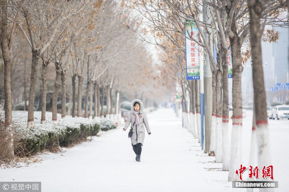 山東濱州發(fā)布道路結冰黃色預警信號市區(qū)出現較明顯降雪,路表溫度低于0℃。圖片來源:視覺中國
