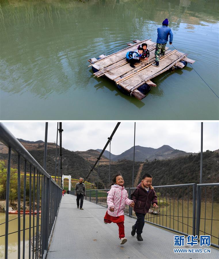 這是一張拼版照片:上圖為略陽縣徐家坪鎮(zhèn)藥木院村江口壩組的余皓軒(左)、劉紫涵(中),由余皓軒的外公劉德安撐上簡易木筏,去對岸的幼兒園上學(2018年11月22日無人機拍攝);下圖為余皓軒(前右)、劉紫涵(前左)放學歸來,手拉手走在新修的鋼結(jié)構吊橋上(2019年3月25日攝)。