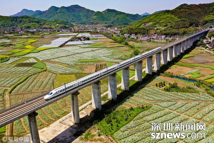 2019年4月8日,一列高鐵列車從京福高鐵安徽銅陵段一片盛開的鳳丹花海中駛過(guò)。隨著氣溫回升,安徽省銅陵市境內(nèi)的鳳丹競(jìng)相綻放,高鐵列車穿行其間,成為春日里一道美麗的風(fēng)景線。