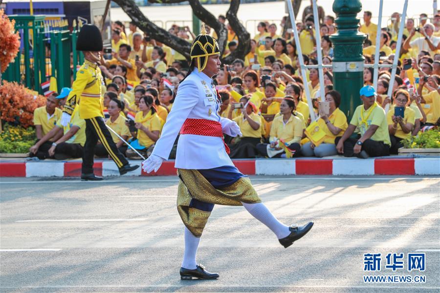5月5日,儀仗隊(duì)在曼谷大王宮附近舉行的泰國國王加冕典禮巡游上列隊(duì)前進(jìn)。  新華社發(fā)(拉亨攝)