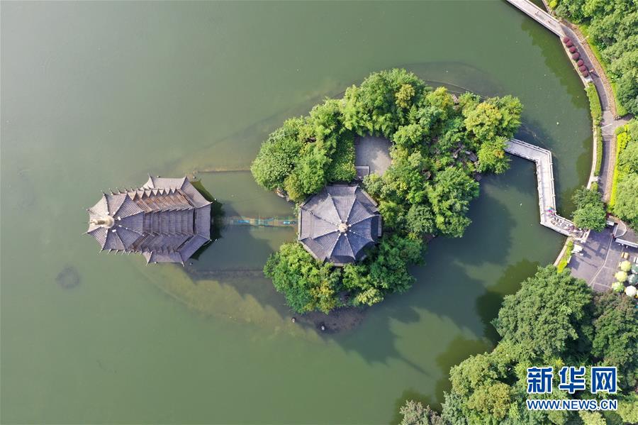 桂林市杉湖景觀(7月1日無人機拍攝)。 夏日時節(jié),廣西桂林市區(qū)內的榕湖、杉湖、桂湖、木龍湖等地綠樹成蔭、景色迷人。 新華社記者陸波岸攝