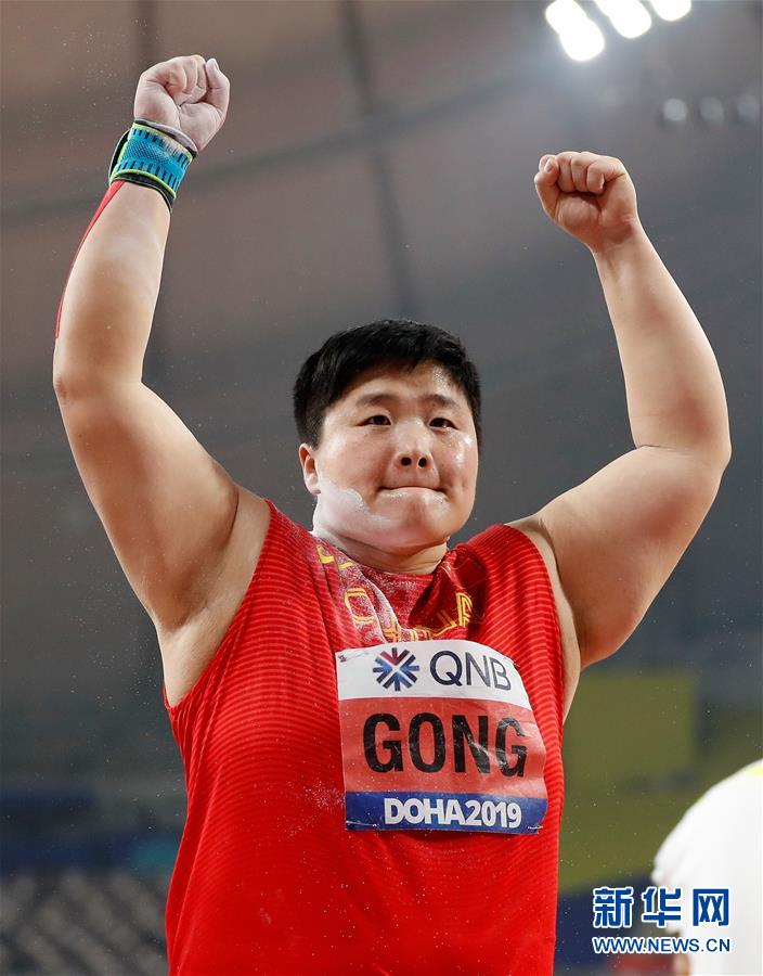 當(dāng)日,在卡塔爾多哈舉行的2019國際田聯(lián)世界田徑錦標(biāo)賽女子鉛球決賽中,衛(wèi)冕冠軍、中國選手鞏立姣以19米55的成績奪得冠軍。 新華社記者王婧嬙攝