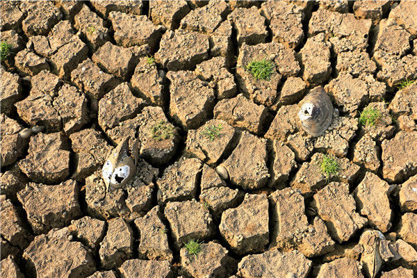 2011年9月21日,江西鄱陽湖,一條沒來及逃離的魚干死在河床上。