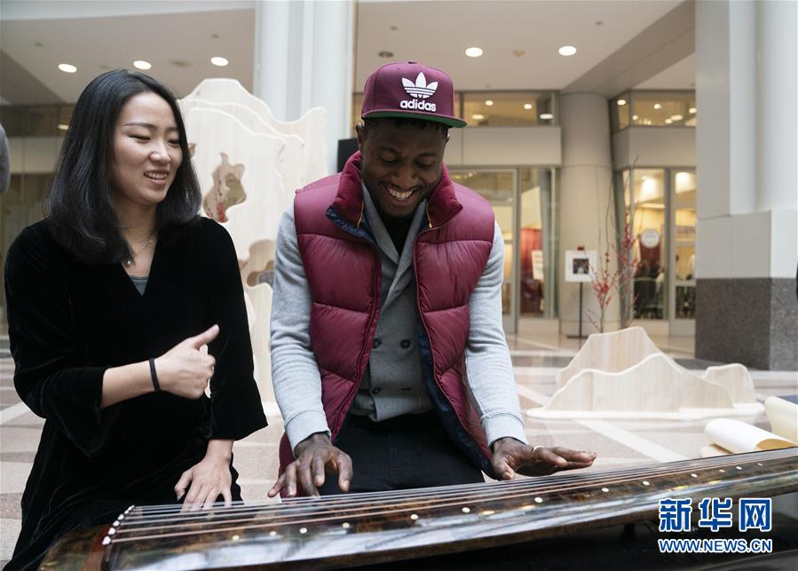 11月22日,在美國華盛頓,一名參加“北京日”文化廟會活動的男子學(xué)習(xí)彈奏古琴。作為中國北京和美國首都華盛頓締結(jié)友好城市35周年慶祝活動的一部分,“北京日”文化廟會22日在華盛頓羅納德·里根大廈和國際貿(mào)易中心舉行。新華社記者劉杰攝