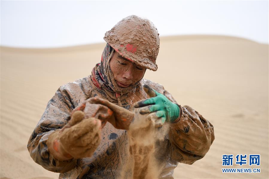 1月13日,鉆井工潘洪星用沙子帶出手套里的泥水。地球物理勘探是油氣開發(fā)的第一步,相當(dāng)于給地球做CT。物探工人按照嚴(yán)格的測線部署,在相應(yīng)位置鉆井,然后實(shí)施地震,采集地震波數(shù)據(jù)??蒲腥藛T通過數(shù)據(jù)組成的“CT片”,就能夠清晰地“看”到地下的地質(zhì)結(jié)構(gòu),判斷哪里埋藏有石油或者天然氣。2019年10月,東方地球物理勘探有限責(zé)任公司塔里木物探處2113隊(duì)進(jìn)入新疆塔克拉瑪干沙漠腹地,開始中古14-21、塔中2兩個(gè)區(qū)塊的三維地震勘探。近2000名物探工人將在1000平方公里的范圍內(nèi)一直工作到2020年4月,這也意味著他們將在塔克拉瑪干沙漠腹地連續(xù)度過第14個(gè)除夕夜。蘊(yùn)藏著豐富石油天然氣資源的新疆塔克拉瑪干沙漠有“死亡之?!敝Q,氣候干燥,年降水量在50毫米以下,冬季地表最低溫度超過零下30攝氏度,是世界油氣勘探難度最大的地區(qū)之一。為避開風(fēng)季,物探工人每年9、10月份進(jìn)入沙漠,一直工作到來年4月,夜以繼日與黃沙、嚴(yán)寒為伴,用辛勤的汗水,為祖國找油找氣。新華社記者丁磊攝
