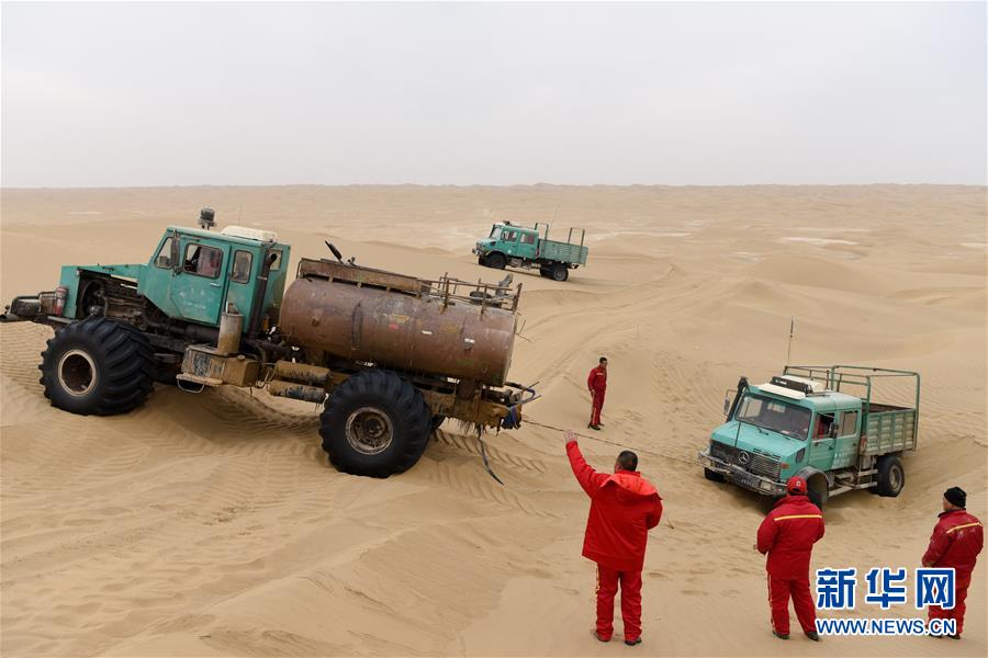 一輛測量作業(yè)車陷在沙坑中,水罐車進(jìn)行營救(1月13日攝)。地球物理勘探是油氣開發(fā)的第一步,相當(dāng)于給地球做CT。物探工人按照嚴(yán)格的測線部署,在相應(yīng)位置鉆井,然后實(shí)施地震,采集地震波數(shù)據(jù)??蒲腥藛T通過數(shù)據(jù)組成的“CT片”,就能夠清晰地“看”到地下的地質(zhì)結(jié)構(gòu),判斷哪里埋藏有石油或者天然氣。2019年10月,東方地球物理勘探有限責(zé)任公司塔里木物探處2113隊(duì)進(jìn)入新疆塔克拉瑪干沙漠腹地,開始中古14-21、塔中2兩個(gè)區(qū)塊的三維地震勘探。近2000名物探工人將在1000平方公里的范圍內(nèi)一直工作到2020年4月,這也意味著他們將在塔克拉瑪干沙漠腹地連續(xù)度過第14個(gè)除夕夜。蘊(yùn)藏著豐富石油天然氣資源的新疆塔克拉瑪干沙漠有“死亡之?!敝Q,氣候干燥,年降水量在50毫米以下,冬季地表最低溫度超過零下30攝氏度,是世界油氣勘探難度最大的地區(qū)之一。為避開風(fēng)季,物探工人每年9、10月份進(jìn)入沙漠,一直工作到來年4月,夜以繼日與黃沙、嚴(yán)寒為伴,用辛勤的汗水,為祖國找油找氣。新華社記者丁磊攝