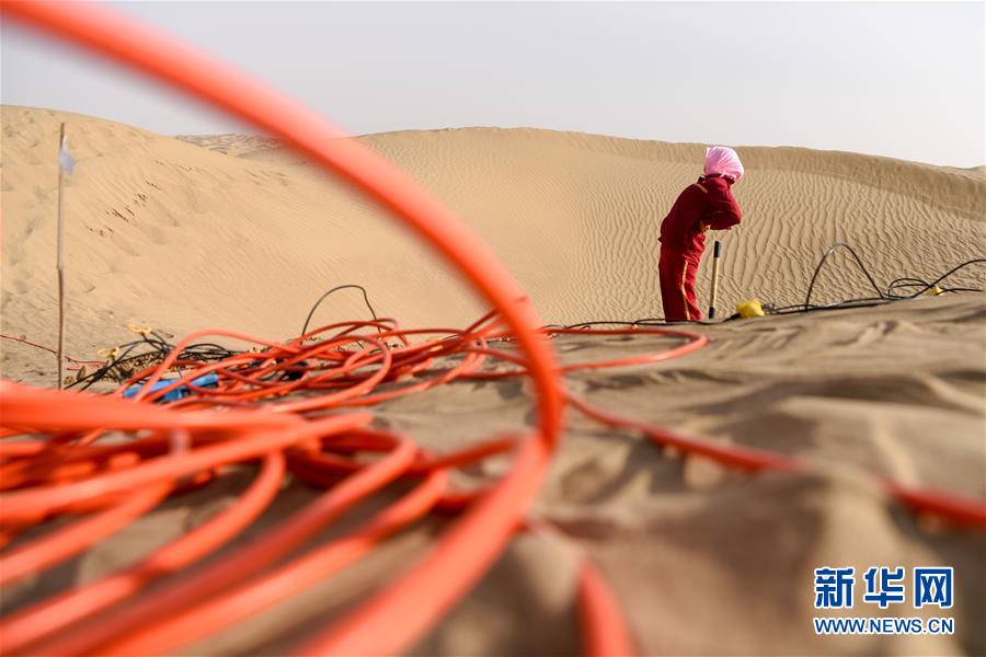 1月14日,放線工張進(jìn)秀在放完一組檢波器后直起腰休息。地球物理勘探是油氣開發(fā)的第一步,相當(dāng)于給地球做CT。物探工人按照嚴(yán)格的測(cè)線部署,在相應(yīng)位置鉆井,然后實(shí)施地震,采集地震波數(shù)據(jù)??蒲腥藛T通過數(shù)據(jù)組成的“CT片”,就能夠清晰地“看”到地下的地質(zhì)結(jié)構(gòu),判斷哪里埋藏有石油或者天然氣。2019年10月,東方地球物理勘探有限責(zé)任公司塔里木物探處2113隊(duì)進(jìn)入新疆塔克拉瑪干沙漠腹地,開始中古14-21、塔中2兩個(gè)區(qū)塊的三維地震勘探。近2000名物探工人將在1000平方公里的范圍內(nèi)一直工作到2020年4月,這也意味著他們將在塔克拉瑪干沙漠腹地連續(xù)度過第14個(gè)除夕夜。蘊(yùn)藏著豐富石油天然氣資源的新疆塔克拉瑪干沙漠有“死亡之?!敝Q,氣候干燥,年降水量在50毫米以下,冬季地表最低溫度超過零下30攝氏度,是世界油氣勘探難度最大的地區(qū)之一。為避開風(fēng)季,物探工人每年9、10月份進(jìn)入沙漠,一直工作到來年4月,夜以繼日與黃沙、嚴(yán)寒為伴,用辛勤的汗水,為祖國找油找氣。新華社記者丁磊攝