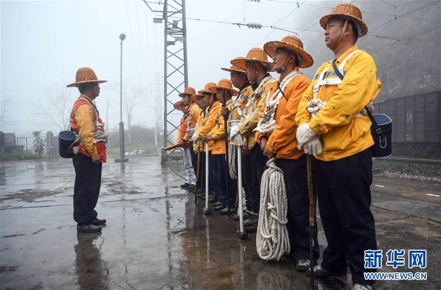 1月14日,百色工務(wù)段白水河橋隧工區(qū)班組工長王勇(左一)在出發(fā)前向班組成員講解注意事項。在中國鐵路南寧局集團公司百色工務(wù)段白水河橋隧工區(qū),有一個由14名工人組成的班組。他們常年像“爬山虎”一樣行走攀爬在地形險峻、云霧繚繞的高山上,負(fù)責(zé)南昆鐵路轄區(qū)路段的搜山掃石工作,清除一切可能危害鐵路行車安全的因素,保障旅客出行安全。新華社記者張愛林?jǐn)z