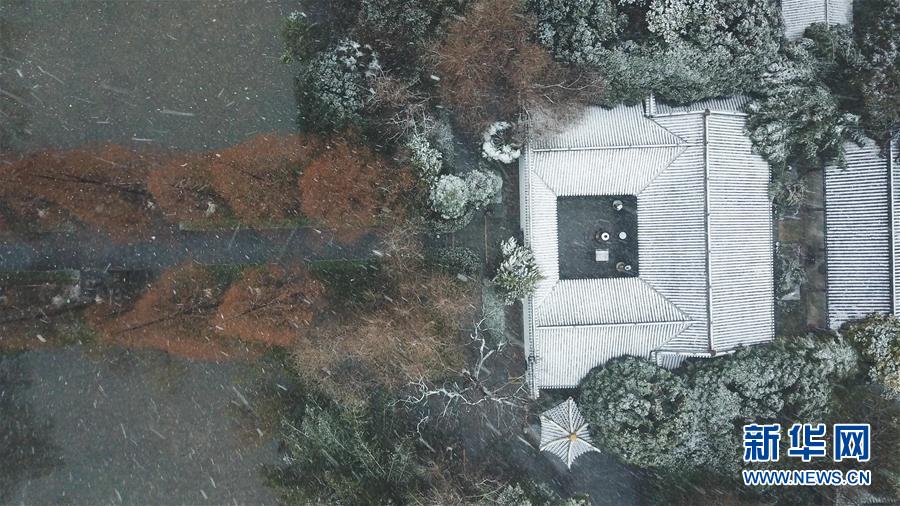 這是1月15日拍攝的合肥市包公園雪景(無人機照片)。 當日,安徽省合肥市迎來降雪天氣。雪中的合肥市包公園景色別致。 新華社記者 張端 攝