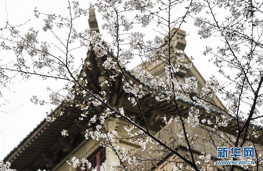 近日,隨著氣溫上升,武漢大學(xué)圖書館附近一片櫻花開放。新華社記者費茂華攝