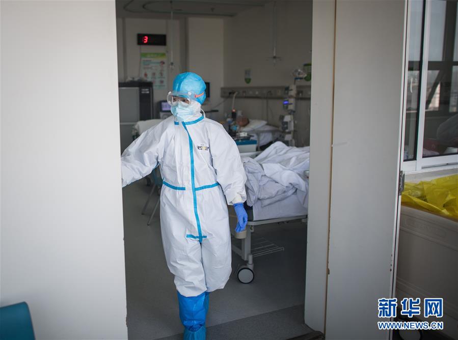 3月19日,在武漢市肺科醫(yī)院隔離病房,海南醫(yī)療隊隊員詹才露在現(xiàn)場忙碌。 新華社記者 肖藝九 攝