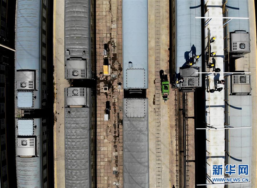 3月19日,鄭州車輛段客車檢車員在登頂平臺(tái)上對(duì)客車空調(diào)機(jī)組進(jìn)行檢修作業(yè)(無人機(jī)照片)。新華社記者 李安 攝