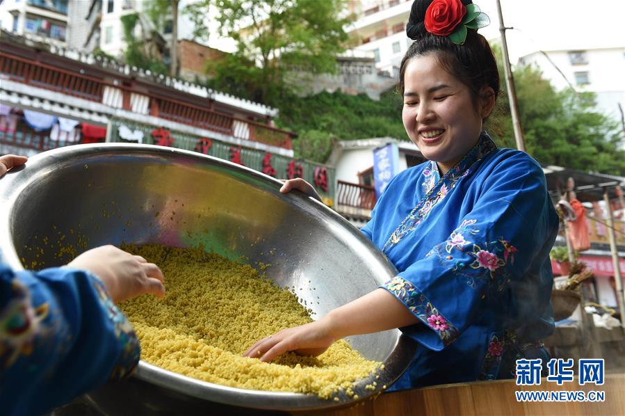 4月17日,在貴州省臺江縣姊妹街哆蝶五彩姊妹飯體驗店,苗家婦女在蒸煮五彩“姊妹飯”。新華社記者楊文斌攝