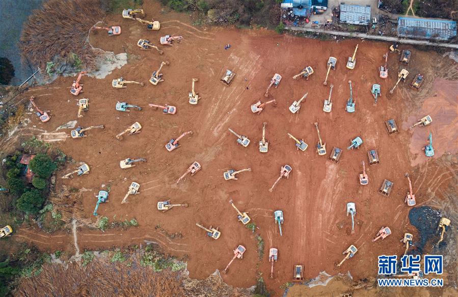 大型機(jī)械在武漢火神山醫(yī)院建設(shè)工地施工(1月24日攝,無人機(jī)照片)。新華社記者肖藝九攝