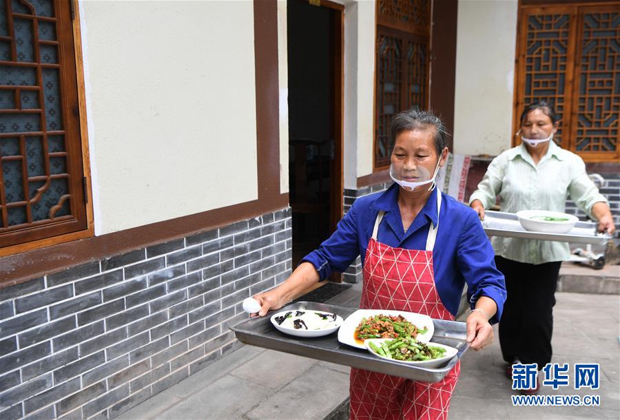 6月4日,萬(wàn)州區(qū)長(zhǎng)嶺鎮(zhèn)安溪村一農(nóng)家樂(lè)的工作人員在上菜。新華社記者王全超攝