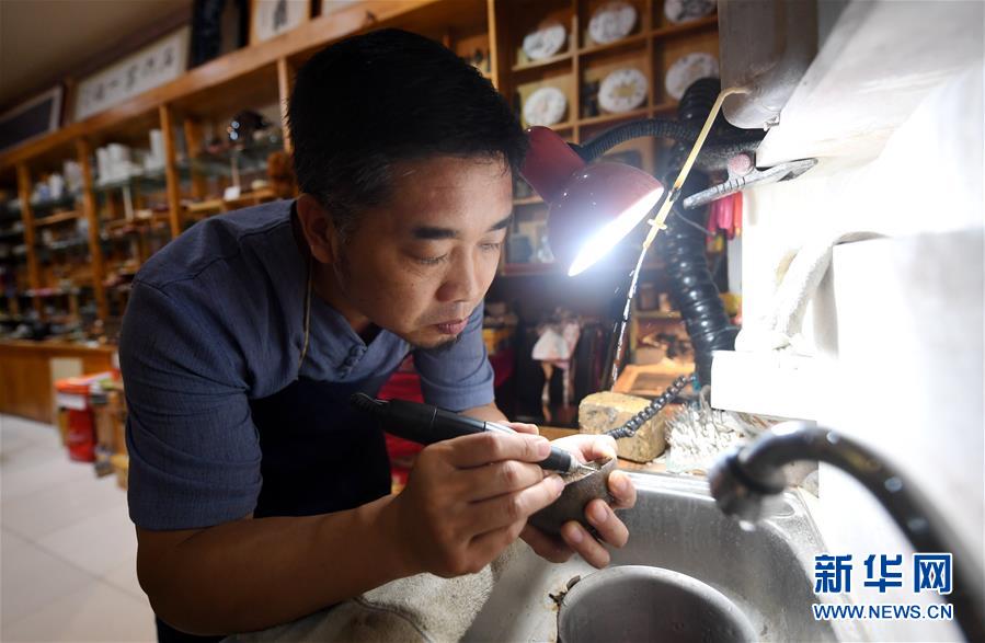 6月8日,在石家莊市橋西區(qū)工作室,李軍航在展示鋦刻好的瓷器。新華社記者王曉攝
