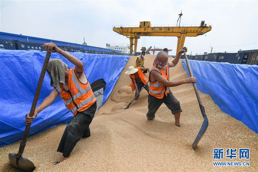 6月10日,在成都糧食集團(tuán)青白江國(guó)家糧食儲(chǔ)備庫(kù),工人在運(yùn)糧火車(chē)的貨廂內(nèi)卸貨。