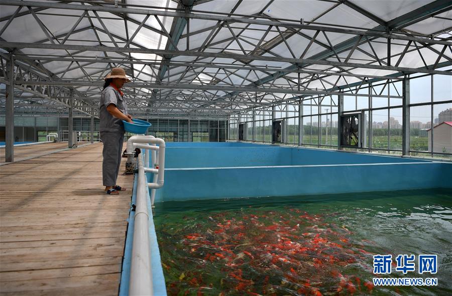 在天津現(xiàn)代晨輝科技集團(tuán)有限公司的養(yǎng)殖示范場,工人在投喂飼料(6月15日攝)。近年來,天津市寶坻區(qū)大白莊鎮(zhèn)大力發(fā)展觀賞魚養(yǎng)殖,在當(dāng)?shù)佚堫^企業(yè)的帶動下,成為增加農(nóng)民收入的新途徑。據(jù)了解,企業(yè)對附近養(yǎng)殖戶統(tǒng)一提供苗種、飼料、技術(shù)支持,以及觀賞魚成魚后保價回收的服務(wù)。養(yǎng)殖戶每畝水面平均收入約1.8萬元,解決周邊農(nóng)民就業(yè)近200人。新華社記者 李然 攝