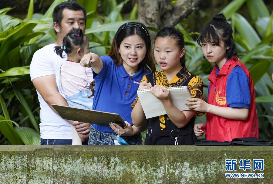 6月18日,在重慶市動(dòng)物園的大熊貓館,九龍坡區(qū)青年志愿者徐小嬌(右一)、張鳳琴(右三)在指導(dǎo)聾啞女孩萍萍(右二)進(jìn)行大熊貓的素描創(chuàng)作。新華社記者劉潺攝