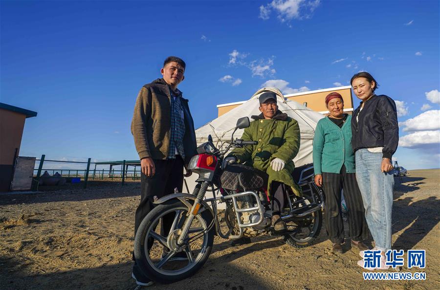 在吉木乃縣萬駝園內,牧民米拉木別克·阿依提克(左二)與家人在房前合影(6月21日攝)。新華社記者趙戈攝
