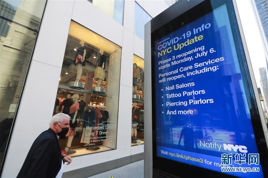 7月4日,一名行人從美國(guó)紐約第五大道顯示新冠疫情最新情況的信息屏旁經(jīng)過。當(dāng)日是美國(guó)獨(dú)立日,美國(guó)多地疫情仍面臨嚴(yán)峻形勢(shì)。美國(guó)約翰斯·霍普金斯大學(xué)實(shí)時(shí)統(tǒng)計(jì)數(shù)據(jù)顯示,美國(guó)累計(jì)新冠確診病例4日已超過280萬例。新華社記者王迎攝