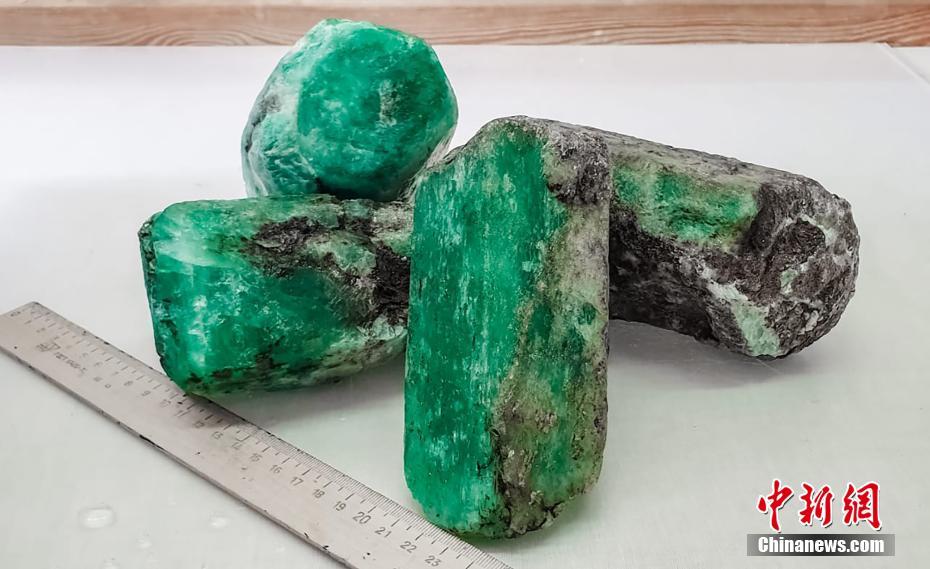 當(dāng)?shù)貢r間7月7日,俄羅斯斯維爾德洛夫斯克州,俄羅斯國家技術(shù)集團在馬林斯克礦區(qū)內(nèi)發(fā)現(xiàn)總重量達4.8公斤的4塊綠寶石,是最近20年來發(fā)現(xiàn)的同類品質(zhì)中最大的寶石。圖片來源:視覺中國