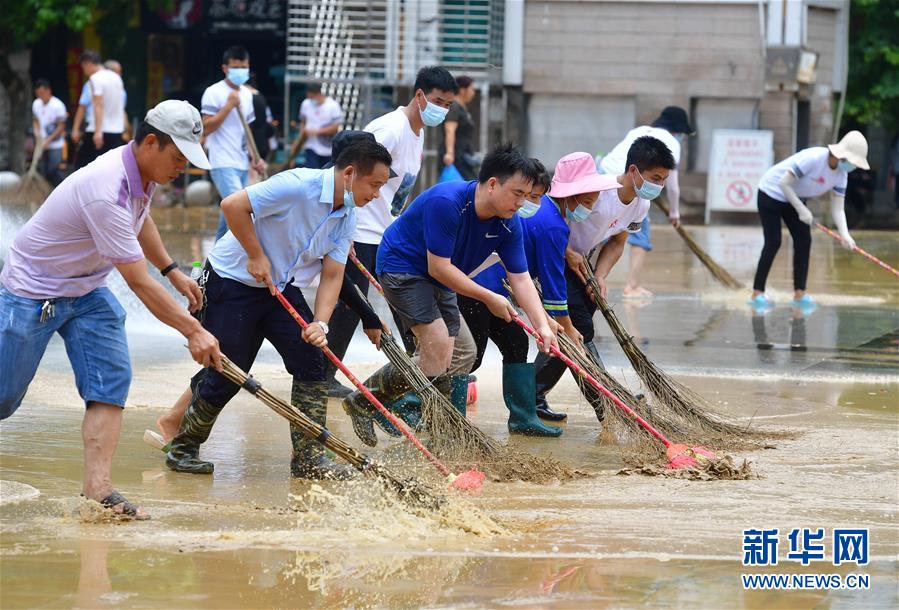 7月12日,融水苗族自治縣文化體育廣電和旅游局清淤小分隊在蘆笙廣場清理地面。當(dāng)日,在廣西柳州市融水苗族自治縣,融江洪水退去,當(dāng)?shù)叵嚓P(guān)部門組織多支清淤排險小分隊,積極開展災(zāi)后恢復(fù)工作。新華社記者 黃孝邦 攝