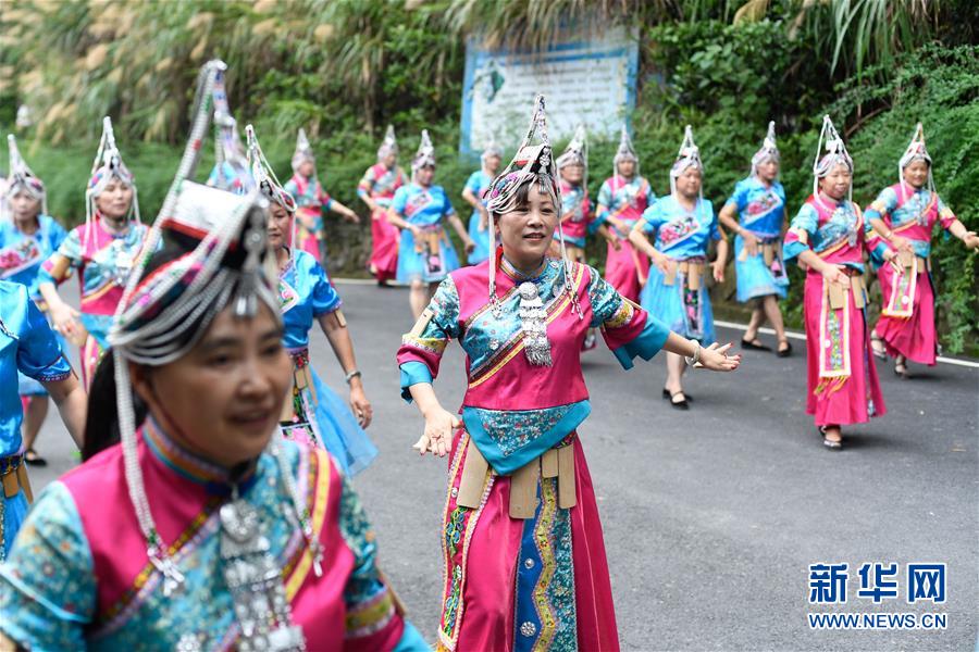 7月18日,身穿傳統(tǒng)服裝的畬族村民在迎候賓客。新華社記者黃宗治攝