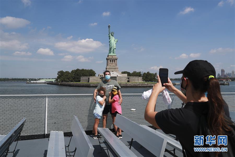 7月20日,參觀者在美國(guó)紐約前往自由島的游艇上拍照留念。美國(guó)紐約市20日繼續(xù)推進(jìn)經(jīng)濟(jì)重啟計(jì)劃,宣布開(kāi)始進(jìn)入解封新階段,進(jìn)一步允許部分低風(fēng)險(xiǎn)文娛活動(dòng)重啟。自由女神像所在的自由島對(duì)公眾開(kāi)放,但雕像內(nèi)部和博物館仍關(guān)閉。新華社記者王迎攝