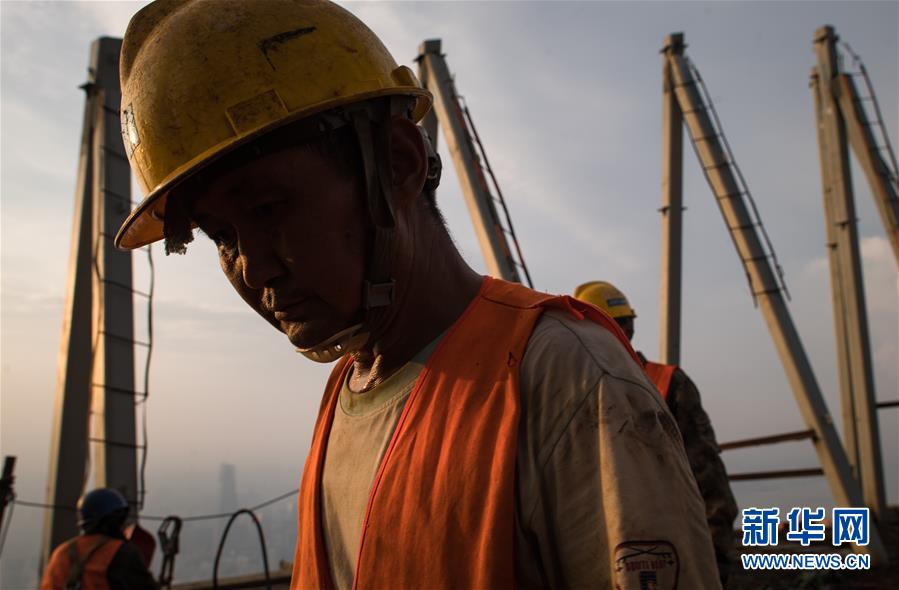 8月11日傍晚,工人在武漢綠地中心項(xiàng)目建設(shè)現(xiàn)場近500米的高空施工。新華社記者肖藝九攝