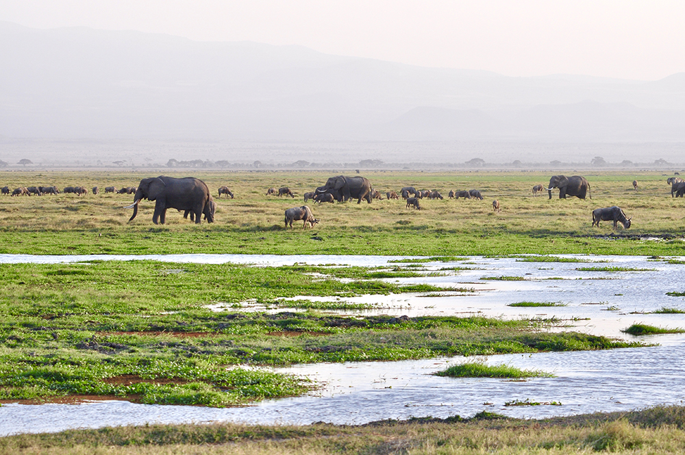 肯尼亞?wèn)|南部,與坦桑尼亞接壤的安博賽利國(guó)家公園,距內(nèi)羅畢240公里,因水草豐美而成為野生非洲大象的樂(lè)園。