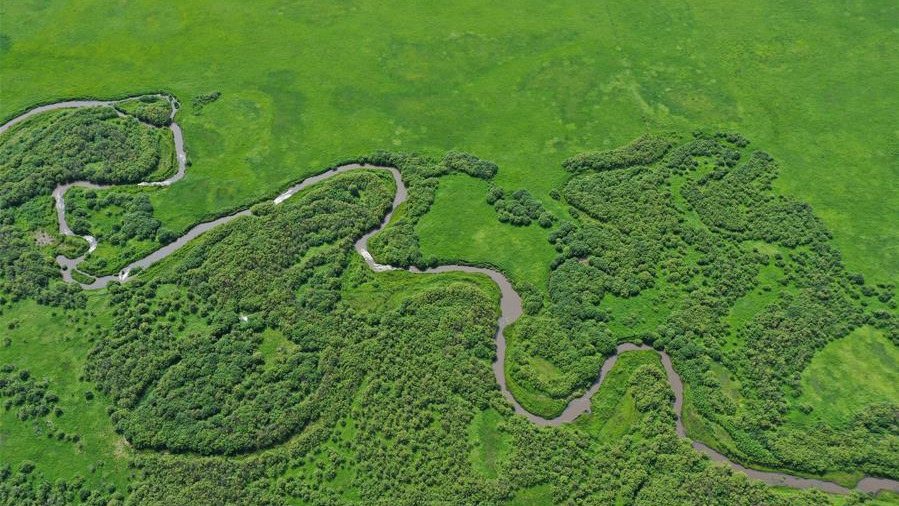 7月2日,在黑龍江省五大連池市的草原上,桑慶軍在三輪車上拋撒飼料喂雞。