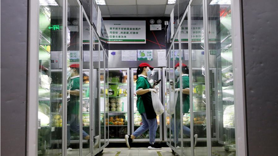 工作人員在新發(fā)地批發(fā)市場周轉(zhuǎn)新區(qū)對進(jìn)場車輛進(jìn)行取樣。