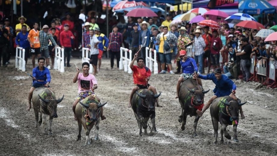 當(dāng)?shù)貢r(shí)間2019年10月12日,泰國春武里舉行一年一度的水牛賽跑,選手騎牛狂奔。
