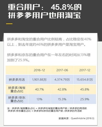 從用戶分布來看,據(jù)企鵝智酷發(fā)布了《拼多多用戶研究報告》,拼多多的一線城市用戶,實(shí)際上只比淘寶低了2個百分點(diǎn);2017年底,有46%的拼多多用戶同時也是淘寶用戶,是所有電商平臺中最高的;拼多多和京東的重合用戶,一年內(nèi)增長了一倍。
