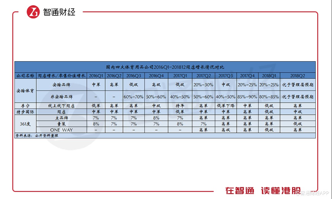 智通財(cái)經(jīng)APP根據(jù)公開(kāi)資料整理發(fā)現(xiàn),特步過(guò)往季度的同店銷售增長(zhǎng)水平時(shí)常保持在中單位數(shù)甚至低單位數(shù)的增長(zhǎng)水平,直到2018年一季度才實(shí)現(xiàn)低雙位數(shù)增長(zhǎng),這也是公司自2013年一季度開(kāi)始披露這一數(shù)據(jù)以來(lái),首次達(dá)到雙位數(shù)增長(zhǎng)。