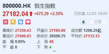 智通財經(jīng)APP獲悉,中美貿(mào)易摩擦憂慮減退,市場情緒得到提振,恒指早盤高開2.56%,報27185.66點。全日維持高位震蕩,截至收盤,恒生指數(shù)漲675.29點或2.55%,報27182.04點,全日成交額達(dá)1296.25億。國企指數(shù)漲2.45%,報10882.16點,紅籌指數(shù)漲1.21%,報4391.2點。