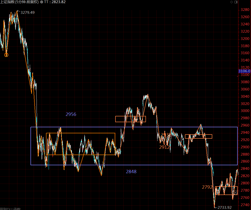 上周市場(chǎng)整體都處在構(gòu)建第三類賣點(diǎn)的階段,周五的高點(diǎn)2840目前初步確認(rèn)為第三類賣點(diǎn)的精確位置,如果就此轉(zhuǎn)下,下一步2792點(diǎn)就顯得尤為重要,如果往下的五分鐘線段未能跌破2792點(diǎn),那這個(gè)位置是一個(gè)合理的建倉(cāng)點(diǎn),等同于針對(duì)下方三十分鐘中樞(九段擴(kuò)張)的第三類買點(diǎn)。