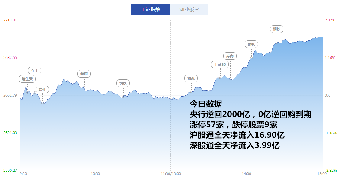 今天漲停家數(shù)較上一交易日有所增加,兩市57家漲停;跌停9家。成交量方面,滬市成交1130億元,深市成交1406億元,兩市總成交額約為2536億元,較上一交易日放量469億元。