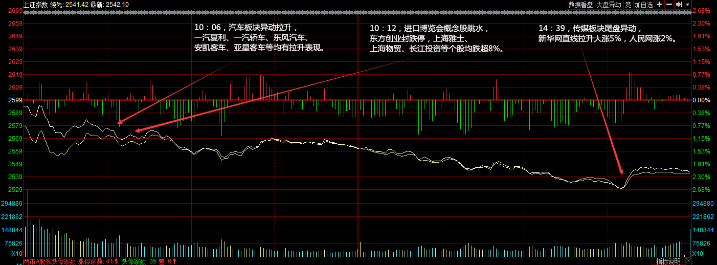 今天漲停家數(shù)較上一交易日有所減少,兩市41家漲停;跌停35家。成交量方面,兩市總成交額約為2554元,較上一交易日縮量272億元。盤面上,板塊多數(shù)收綠,白酒、旅游、煤炭、自由貿(mào)易港等板塊跌幅居前。