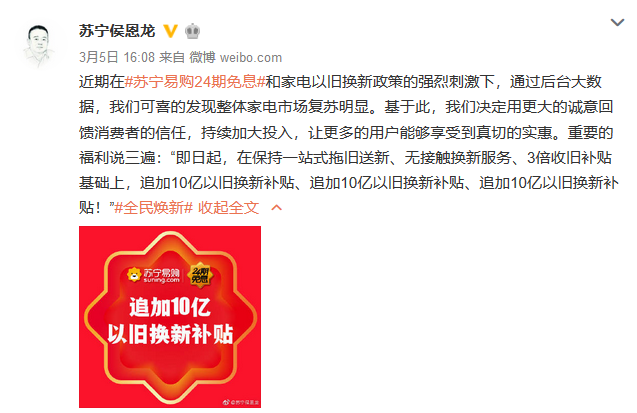繼官宣24期免息政策后,蘇寧侯恩龍3月5日再發(fā)聲,微博表示將在315節(jié)點(diǎn)重磅加碼以舊換新業(yè)務(wù),“即日起,在保持一站式以舊換新、無接觸換新服務(wù)、3倍收舊補(bǔ)貼基礎(chǔ)上,追加10億以舊換新補(bǔ)貼”。