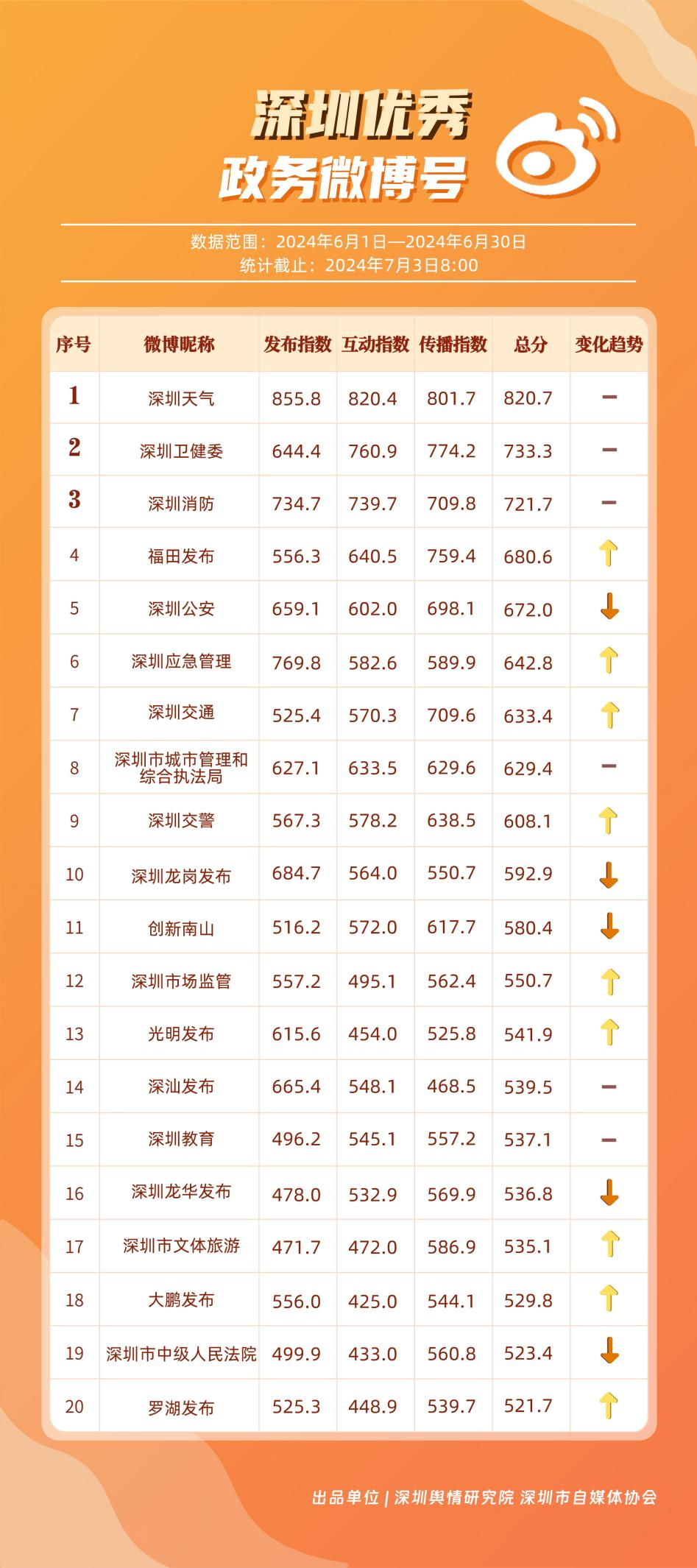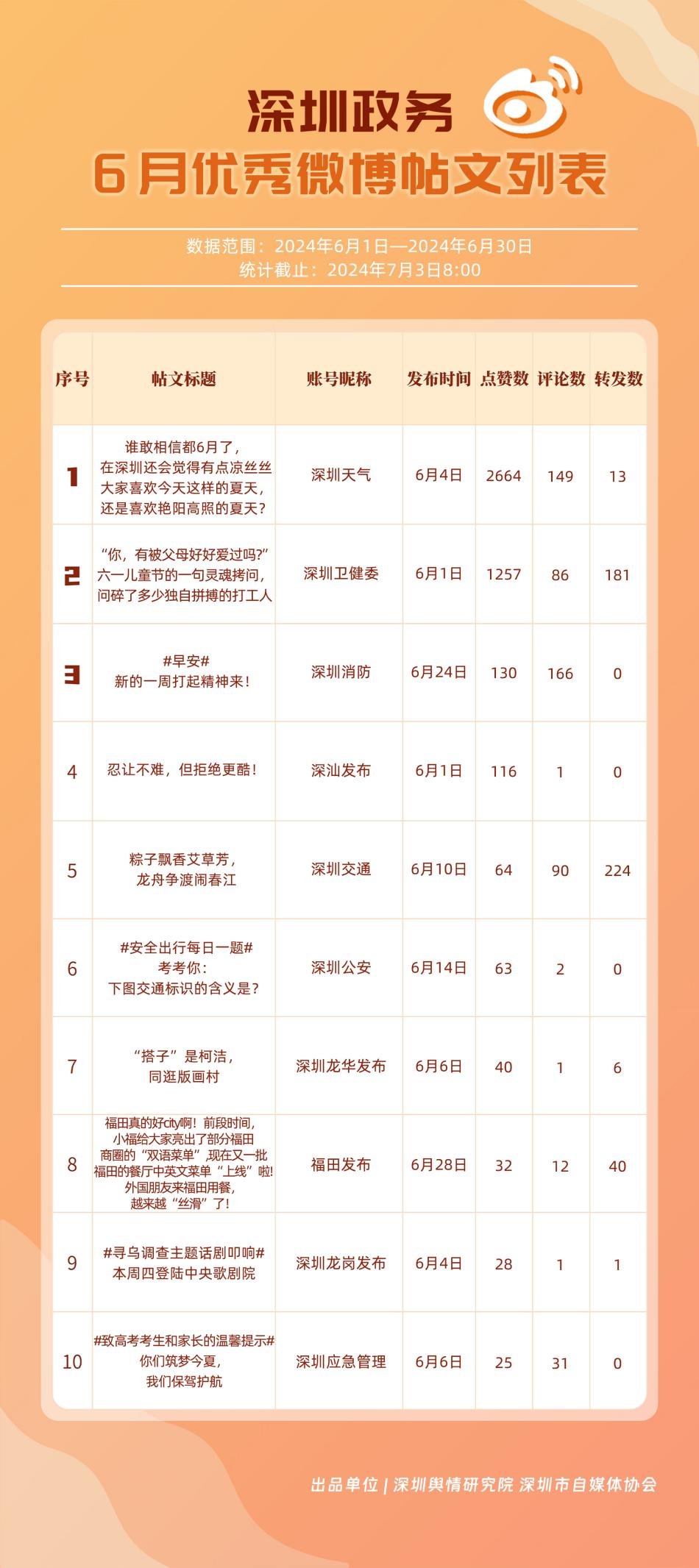 6月,“深圳天氣”“深圳衛(wèi)健委”“深圳消防”“福田發(fā)布”“深圳公安”“深圳應(yīng)急管理”“深圳交通”“深圳市城市管理和綜合執(zhí)法局”“深圳交警”“深圳龍崗發(fā)布”等20個(gè)政務(wù)微博號(hào)入列“優(yōu)秀”名單。“深圳天氣”“深圳衛(wèi)健委”“深圳消防”等賬號(hào)抓住微博平臺(tái)的傳播特征,持續(xù)輸出優(yōu)質(zhì)內(nèi)容,滿(mǎn)足受眾需求,不斷提高用戶(hù)體驗(yàn)和傳播效果。