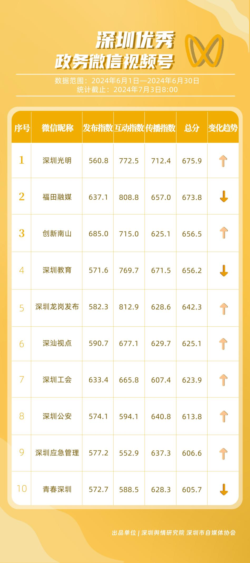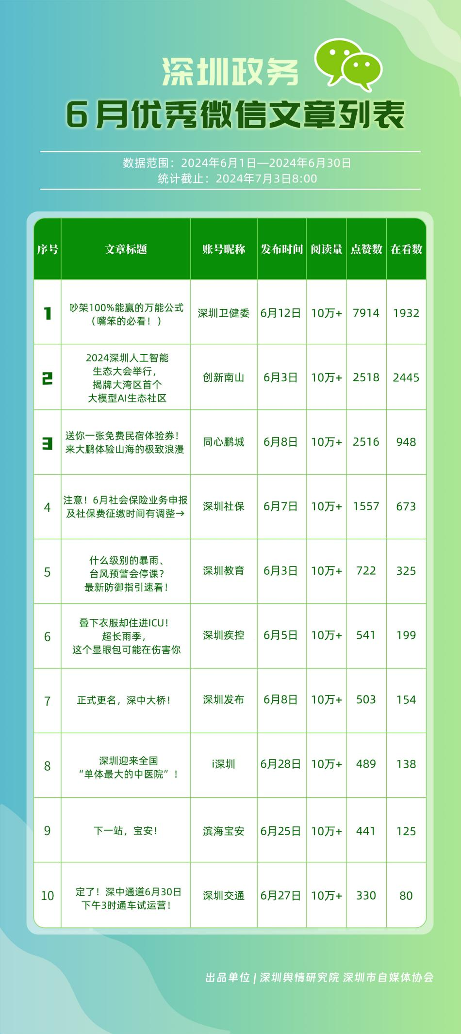 6月,“深圳衛(wèi)健委”“i深圳”“深圳龍崗發(fā)布”“幸福福田”“深圳交通”“深圳教育”“濱海寶安”“創(chuàng)新南山”“深圳工會(huì)”“青春深圳”“同心鵬城”“深圳光明”等30個(gè)政務(wù)微信公眾號(hào),被評(píng)為“深圳優(yōu)秀政務(wù)微信公眾號(hào)”。6月,“深圳衛(wèi)健委”因內(nèi)容策劃出色、受眾互動(dòng)活躍、作品火熱“出圈”等,榮登排行榜首位。“創(chuàng)新南山”“同心鵬城”“深圳社?!薄吧钲诮逃钡壬习窆娞?hào)也積極創(chuàng)作優(yōu)質(zhì)作品,抓住時(shí)下熱點(diǎn)趨勢(shì),集中發(fā)揮政務(wù)媒體傳播力量,推動(dòng)了政務(wù)信息傳播工作提質(zhì)增效。