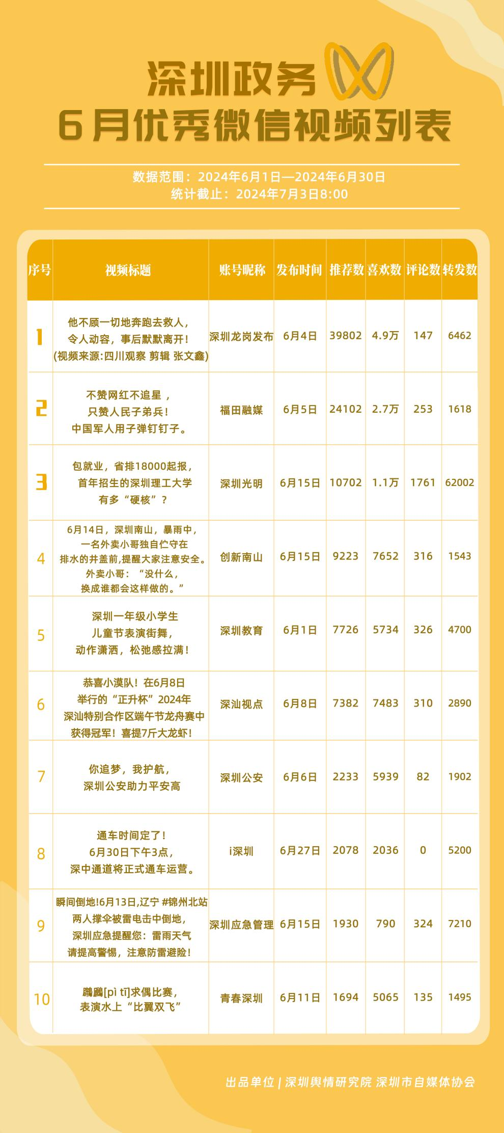 6月,政務(wù)微信視頻號(hào)“深圳光明”“福田融媒”“創(chuàng)新南山”“深圳教育”“深圳龍崗發(fā)布”“深汕觀點(diǎn)”“深圳工會(huì)”“深圳公安”“深圳應(yīng)急管理”和“青春深圳”榮獲“深圳優(yōu)秀政務(wù)微信視頻號(hào)”稱(chēng)號(hào)。結(jié)合整體數(shù)據(jù)來(lái)看,6月深圳政務(wù)視頻號(hào)平臺(tái)推出多條爆款視頻,如《他不顧一切地奔跑去救人,令人動(dòng)容,事后默默離開(kāi)!》《不贊網(wǎng)紅不追星,只贊人民子弟兵!中國(guó)軍人用子彈釘釘子》等作品,收獲了上萬(wàn)的推薦數(shù)和喜歡數(shù),是政務(wù)信息傳播高效化和正能量傳播機(jī)制的體現(xiàn)。