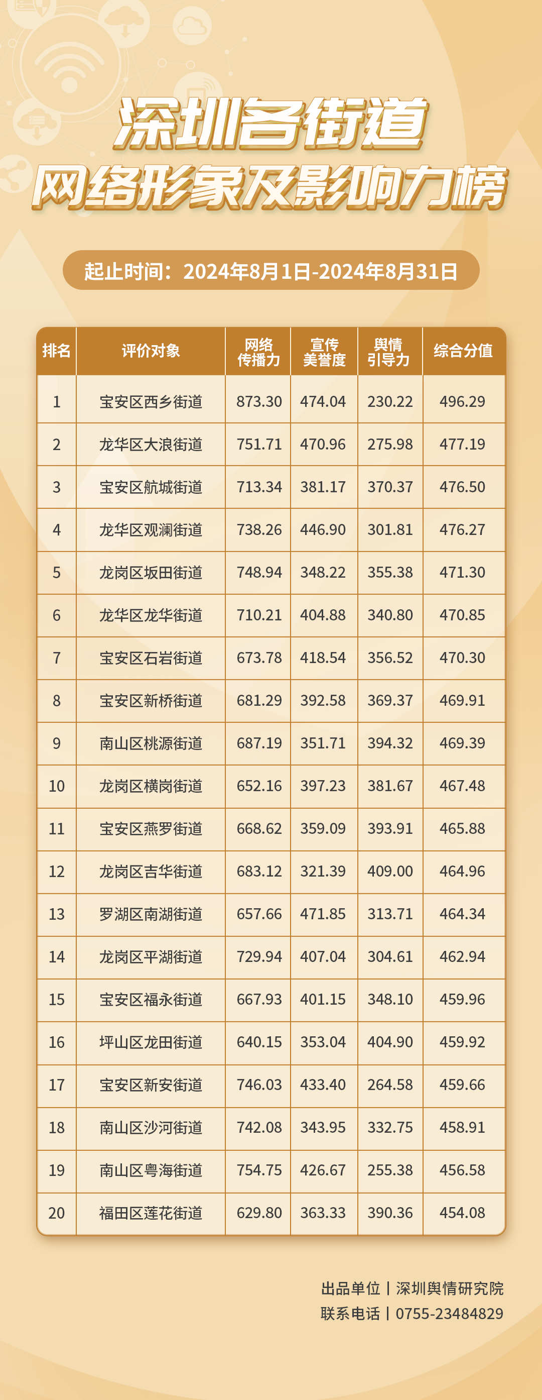 2024年8月,各街道不斷探索治理新路徑,力求效能躍升,《深圳各街道網(wǎng)絡(luò)形象及影響力榜》(8月榜單)發(fā)布,為您揭曉哪些街道網(wǎng)絡(luò)形象治理實(shí)效顯著,成標(biāo)桿,本期榜單數(shù)據(jù)統(tǒng)計范圍為2024年8月1日至8月31日。