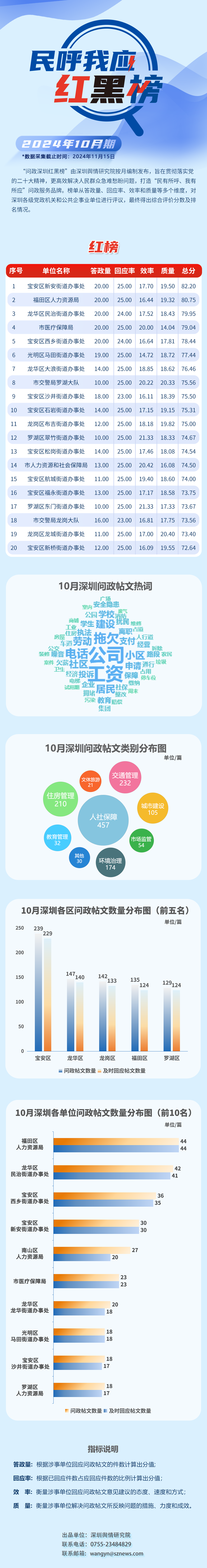 “深圳民呼我應(yīng)紅黑榜”由深圳輿情研究院按月編制發(fā)布,旨在貫徹落實(shí)黨的二十大精神,更高效解決人民群眾急難愁盼問題,打造“民有所呼、我有所應(yīng)”問政服務(wù)品牌。榜單從答政量、回應(yīng)率、效率和質(zhì)量等多個維度對深圳各級黨政機(jī)關(guān)和公共企事業(yè)單位進(jìn)行評議,最終得出綜合評價分?jǐn)?shù)及排名情況。