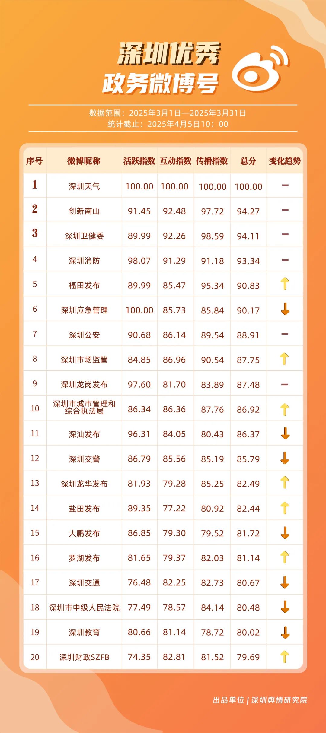 3月,市衛(wèi)生健康委、龍崗區(qū)、市氣象局、深汕特別合作區(qū)、南山區(qū)、福田區(qū)、市應急管理局、龍華區(qū)、寶安區(qū)、光明區(qū)榮登“深圳優(yōu)秀政務新媒體矩陣”榜單。3月,市衛(wèi)生健康委新媒體矩陣持續(xù)關注市民身心健康,發(fā)布健康科普內(nèi)容,穩(wěn)居榜單第一位;龍崗區(qū)新媒體矩陣在抖音、微信視頻號平臺發(fā)力宣傳,躍居榜單第二位;市氣象局新媒體矩陣在微博平臺連續(xù)多期獲得滿分,持續(xù)以氣象預警與生活指南結合的內(nèi)容模式,為市民帶來便利信息。以上賬號在“深圳優(yōu)秀政務新媒體矩陣”榜單中榮獲前三名。此外,深汕特別合作區(qū)新媒體矩陣積極發(fā)布網(wǎng)絡熱點內(nèi)容,收獲較多網(wǎng)民關注分享;南山區(qū)新媒體矩陣多平臺實力強勁,以88.37分居于榜單第五位。值得關注的是,寶安區(qū)新媒體矩陣時隔多期躋身榜單前十名,多平臺均衡發(fā)展成效初顯。