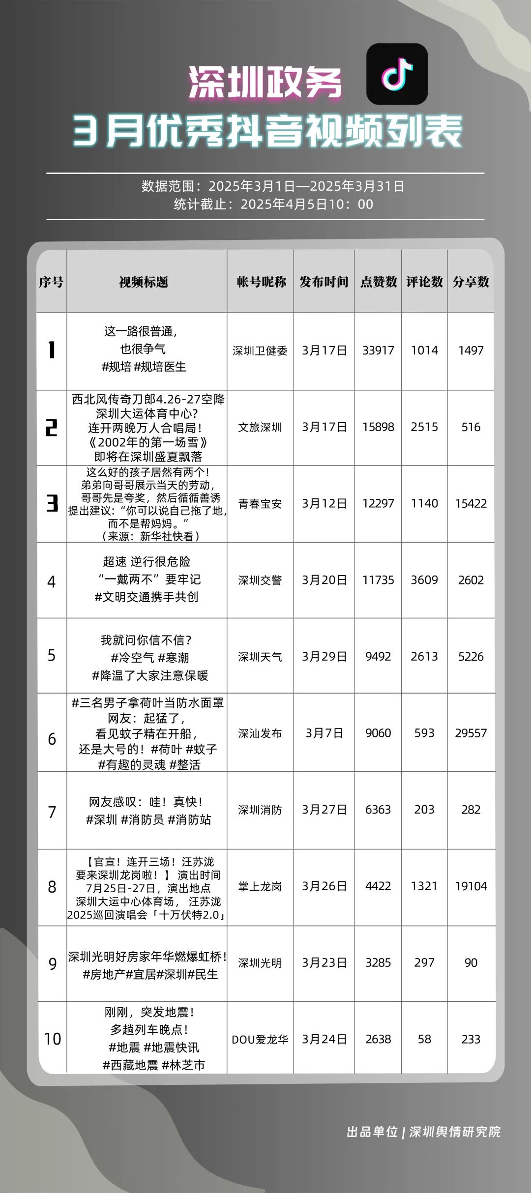 3月,“深汕發(fā)布”“掌上龍崗”“深圳天氣”“文旅深圳”“深圳衛(wèi)健委”“青春寶安”“深圳交警”“DOU愛龍華”“青春深圳”“深圳工會”共10個政務抖音號獲得“深圳優(yōu)秀政務抖音號”稱號。其中,“深汕發(fā)布”位于榜單第一名,3月共收獲5萬余次點贊、8萬余次轉(zhuǎn)發(fā),反映出賬號作品的較高吸引力;“深圳龍崗”以98.85分位于榜單第二名,與榜首分差微小,整體實力不俗。緊隨其后的分別是“深圳天氣”“文旅深圳”“深圳衛(wèi)健委”,三賬號產(chǎn)出內(nèi)容優(yōu)質(zhì),也獲得較高評分。相關上榜單位展現(xiàn)了深圳政務新媒體賬號在短視頻傳播領域的創(chuàng)新探索力與傳播實效性。