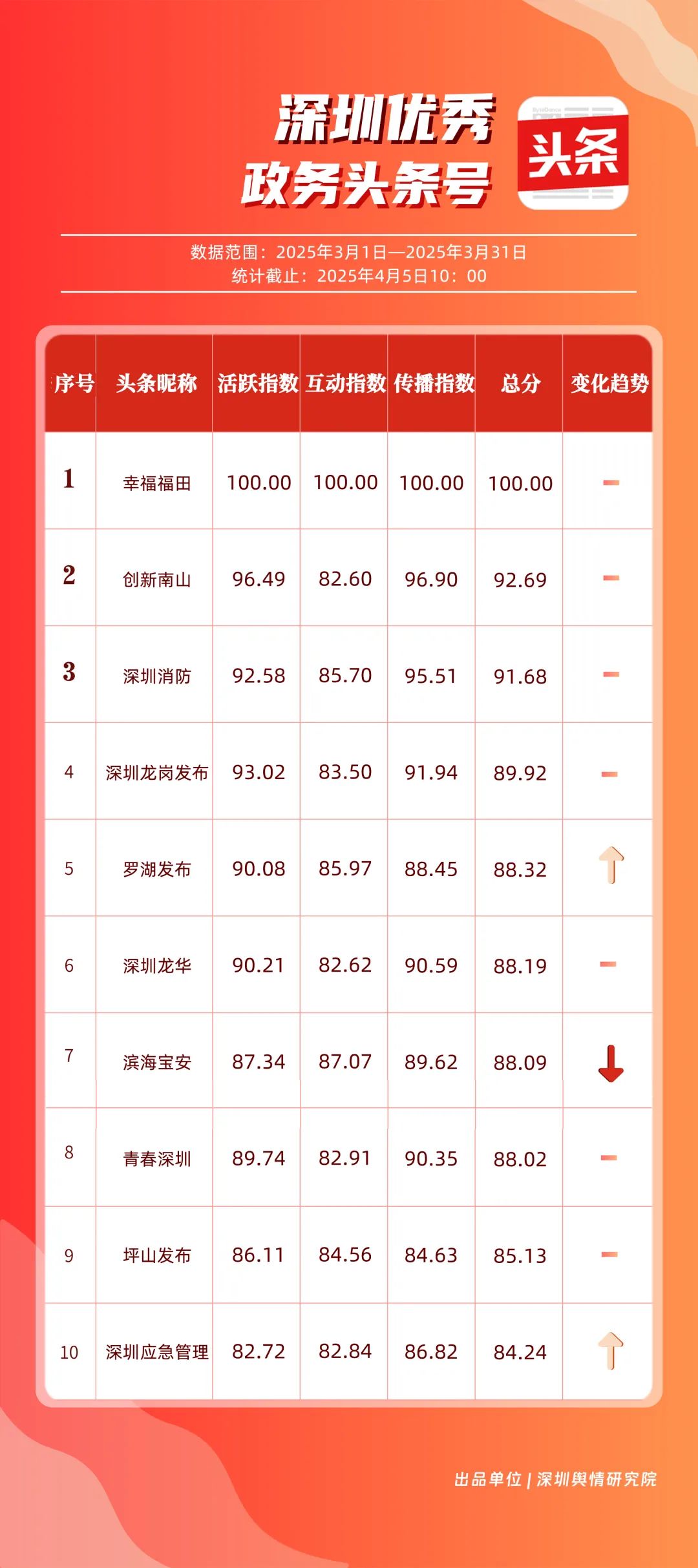 3月,“幸福福田”“創(chuàng)新南山”“深圳消防”“深圳龍崗發(fā)布”“羅湖發(fā)布”“深圳龍華”“濱海寶安”“青春深圳”“坪山發(fā)布”“深圳應急管理”共10個政務頭條號入選“優(yōu)秀政務頭條號”榜單。上榜賬號中,“幸福福田”“創(chuàng)新南山”“深圳消防”“深圳龍崗發(fā)布”在頭條平臺排名較為穩(wěn)固,排名未產(chǎn)生變動。當月,“深圳應急管理”以84.24分躋身榜單前十。